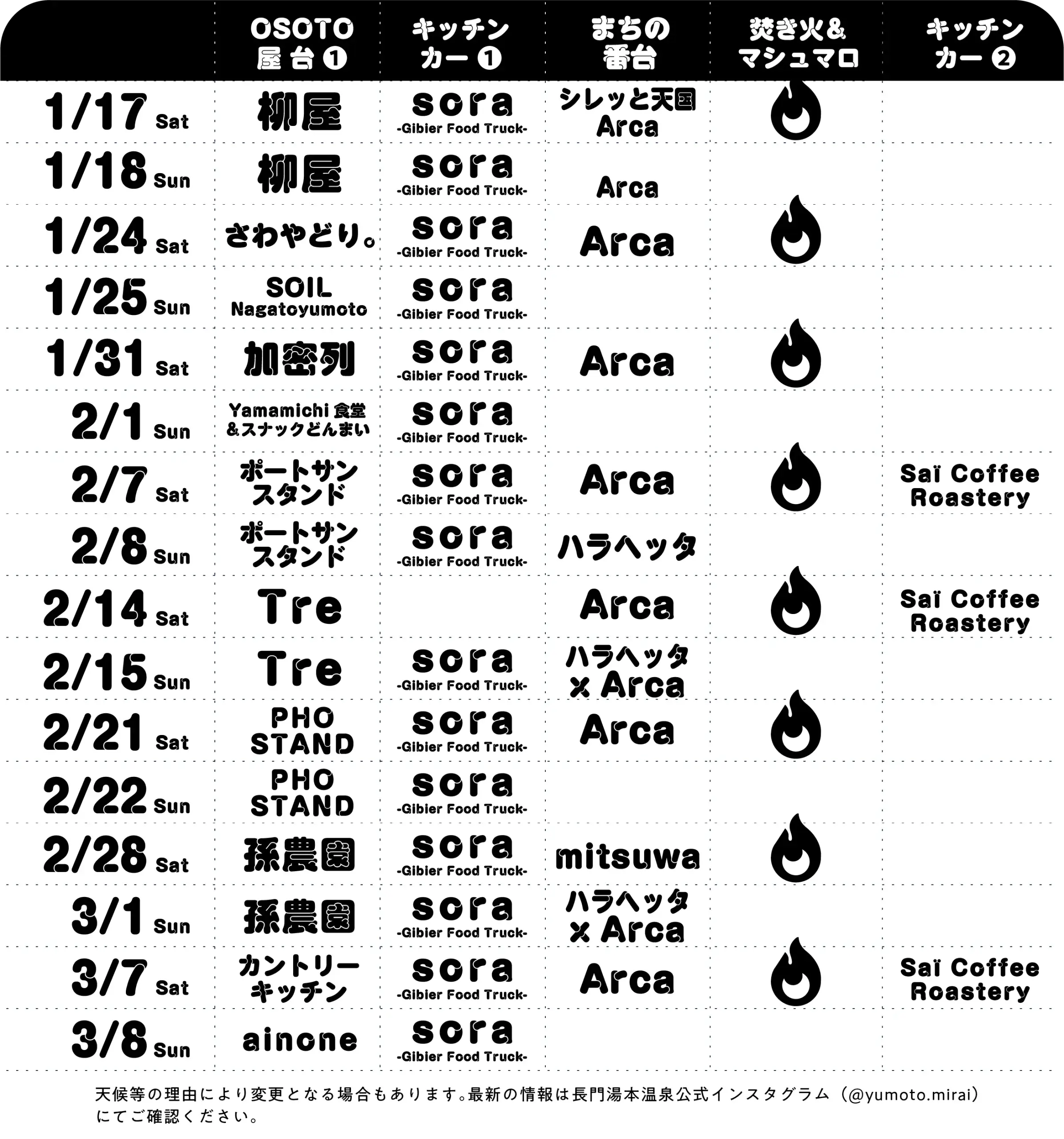 ※天候等の理由により変更となる場合もあります。最新の情報は長門湯本温泉公式インスタグラム(@yumoto.mirai)にてご確認ください。