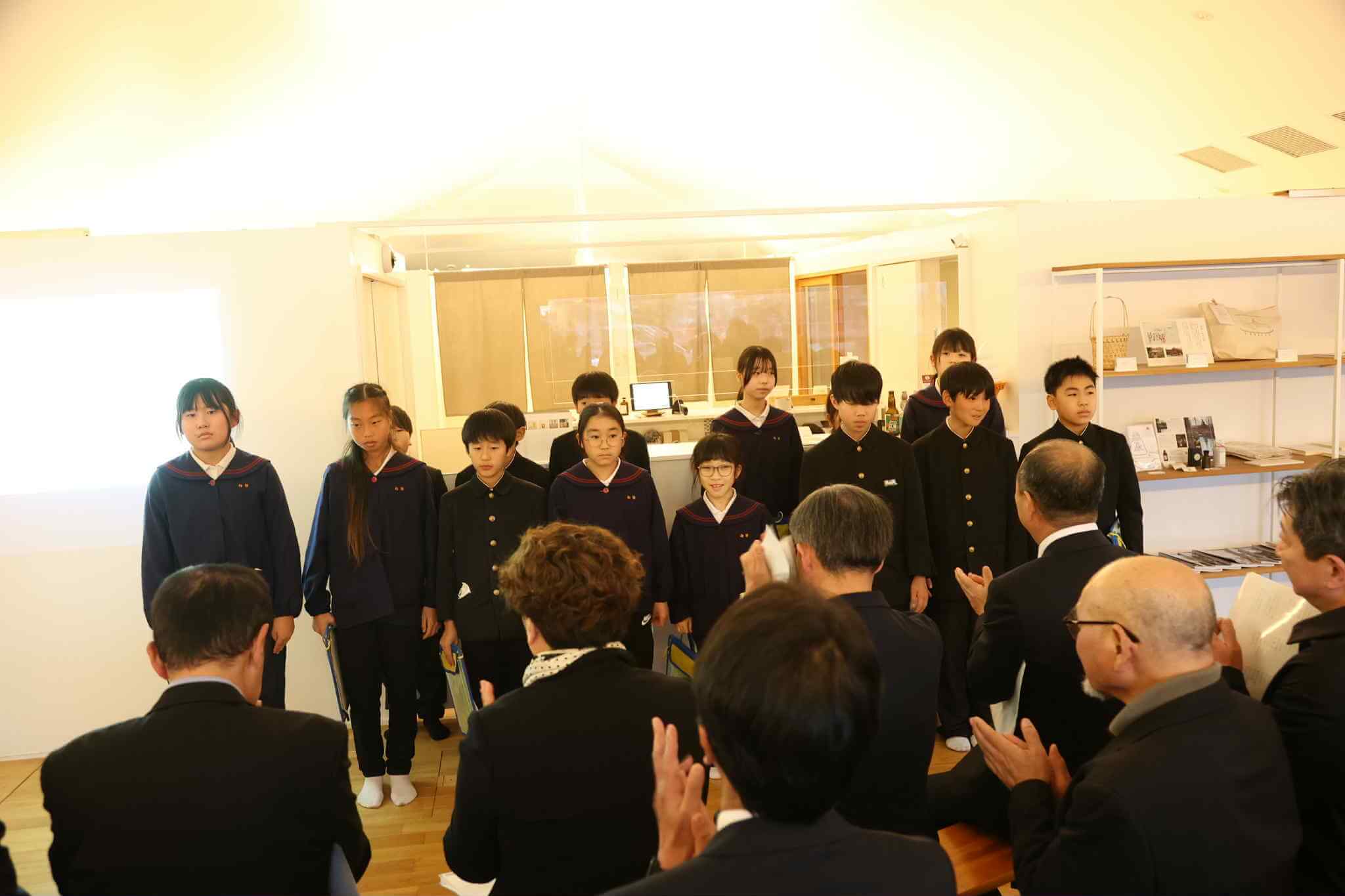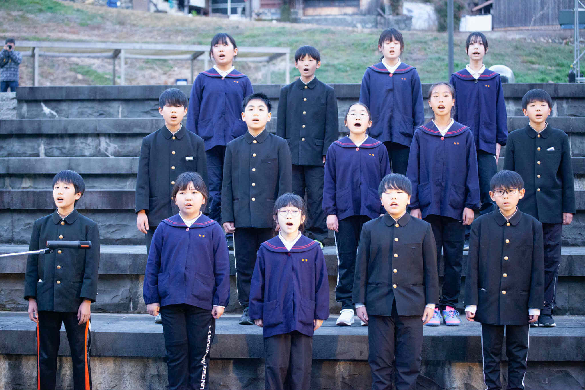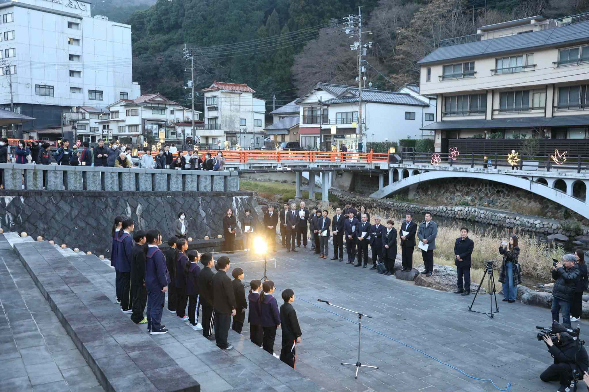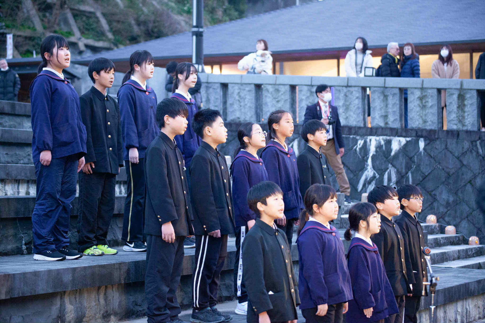その後、温泉街の大切な仲間である向陽小学校5・6年生が登場し、これまでの地域との取り組みを堂々と発表してくれました。フィナーレには全員が恩湯広場へと移動し、冬の夜空に響き渡る児童たちの澄んだ合唱を鑑賞。心に深く届くその歌声に、見守る観客からは大きな拍手が送られます。
