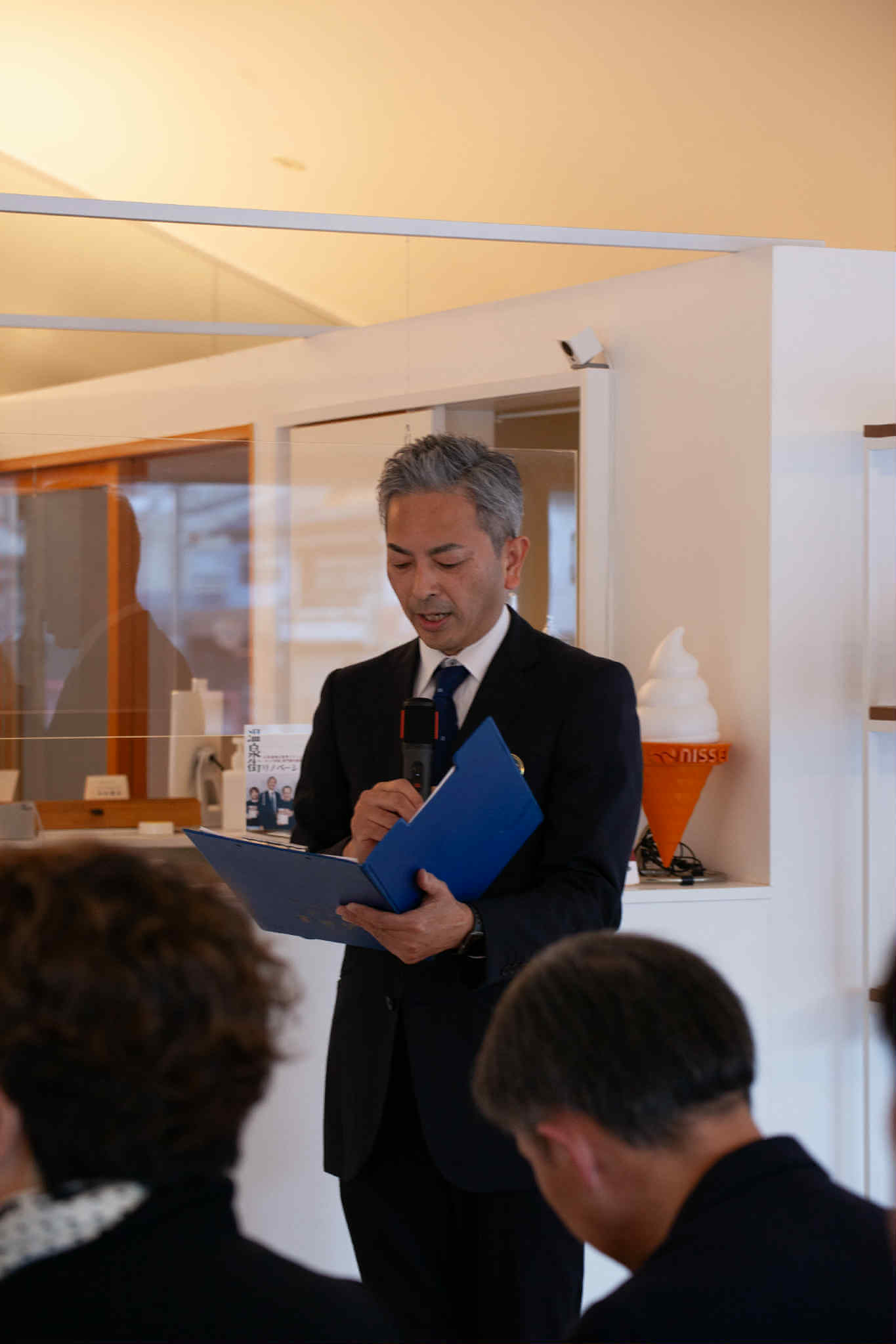 長門湯本温泉まち株式会社の代表取締役・伊藤就一さんの司会で進行した式典では、江原達也長門市長、笠本俊也山口県議会議員、MFG ZONEプラニングの蔵重嘉伸社長が来賓として登壇し、温かい祝辞が述べられました。続いて、エリアマネージャーの木村隼斗さんがイベントの歩みを語り、クリエイティブディレクターの長町志穂さんが今年ならではのライティングの見どころを詳しく解説。専門的な視点からの解説に、会場の期待も高まります。
